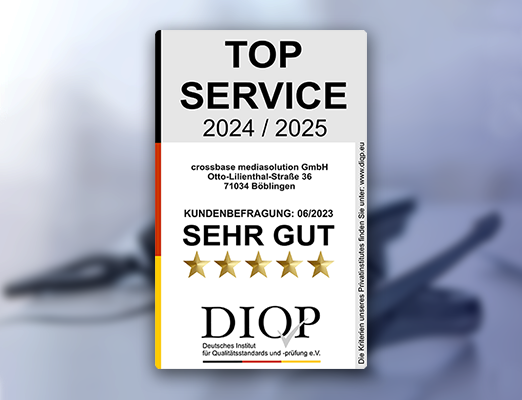 crossbase impresses with excellent customer service in terms of availability, friendliness, response time and handling customer feedback. This earned the company the "Top Service" award with the grade "very good" from the German Institute for Quality Standards and Testing (DIQP).