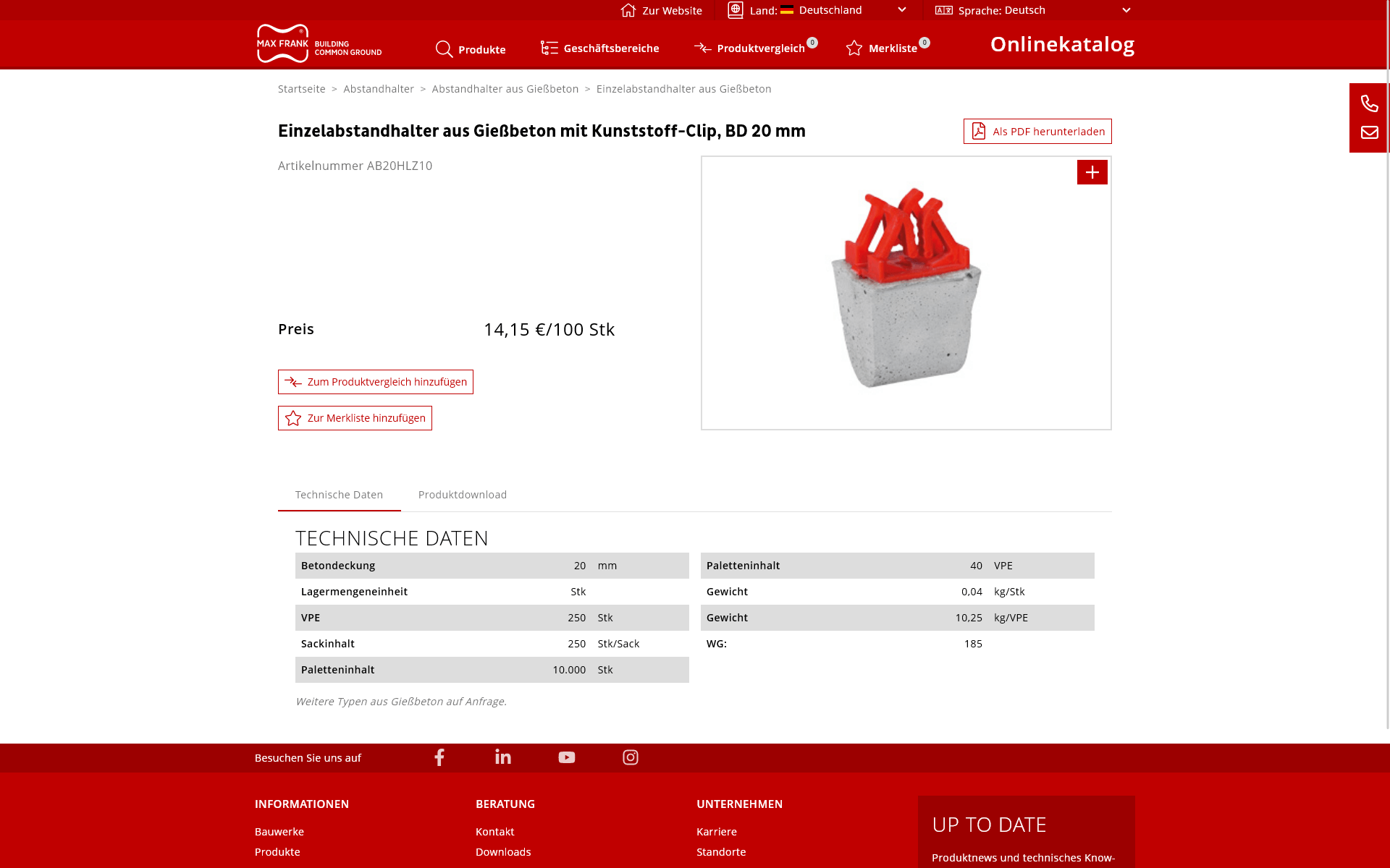 Each article page can be output as a daily updated data sheet in PDF format at the click of a mouse, which contains hyperlinks back to the online catalog. The product range lists, the print catalog of MAX FRANK, also do not contain any price information, but also link to the online catalog via the article number, where daily updated prices from the database are given.