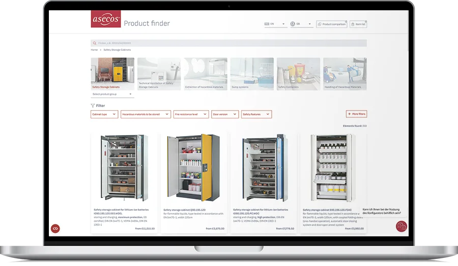 The new product finder was developed in close coordination with asecos in weekly exchange meetings. The basic layouter was designed by the customer and further developed in collaboration with crossbase.